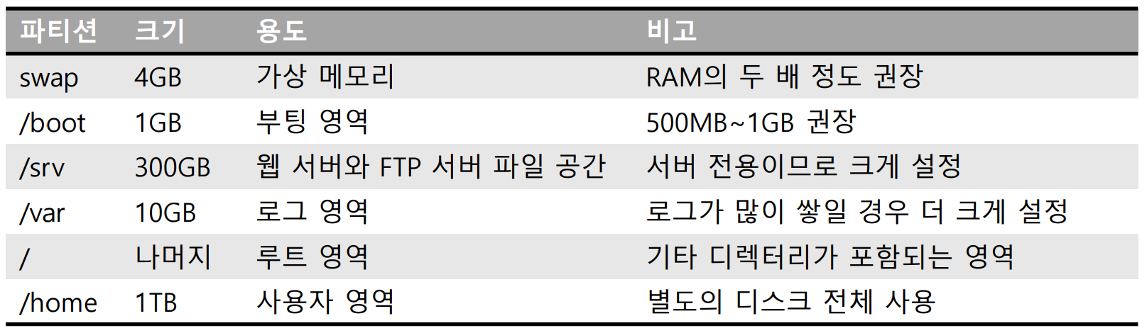 • 여러 사용자가 접속하고 웹 서버와 FTP 서버용으로 이용한다는 전제하에 파티션 구성