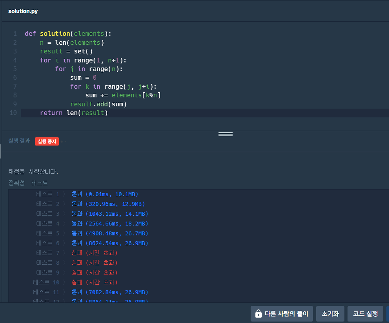 원형 수열은 처음과 끝이 연결되어 끊기는 부분이 없기 때문에 연속하는 부분 수열도 일반적인 수열보다 많아집니다.원형 수열의 모든 원소 elements가 순서대로 주어질 때, 원형 수열의 연속 부분 수열 합으로 만들 수 있는 수의 개수를 return 하도록 solution 함수를 완성해주세요.