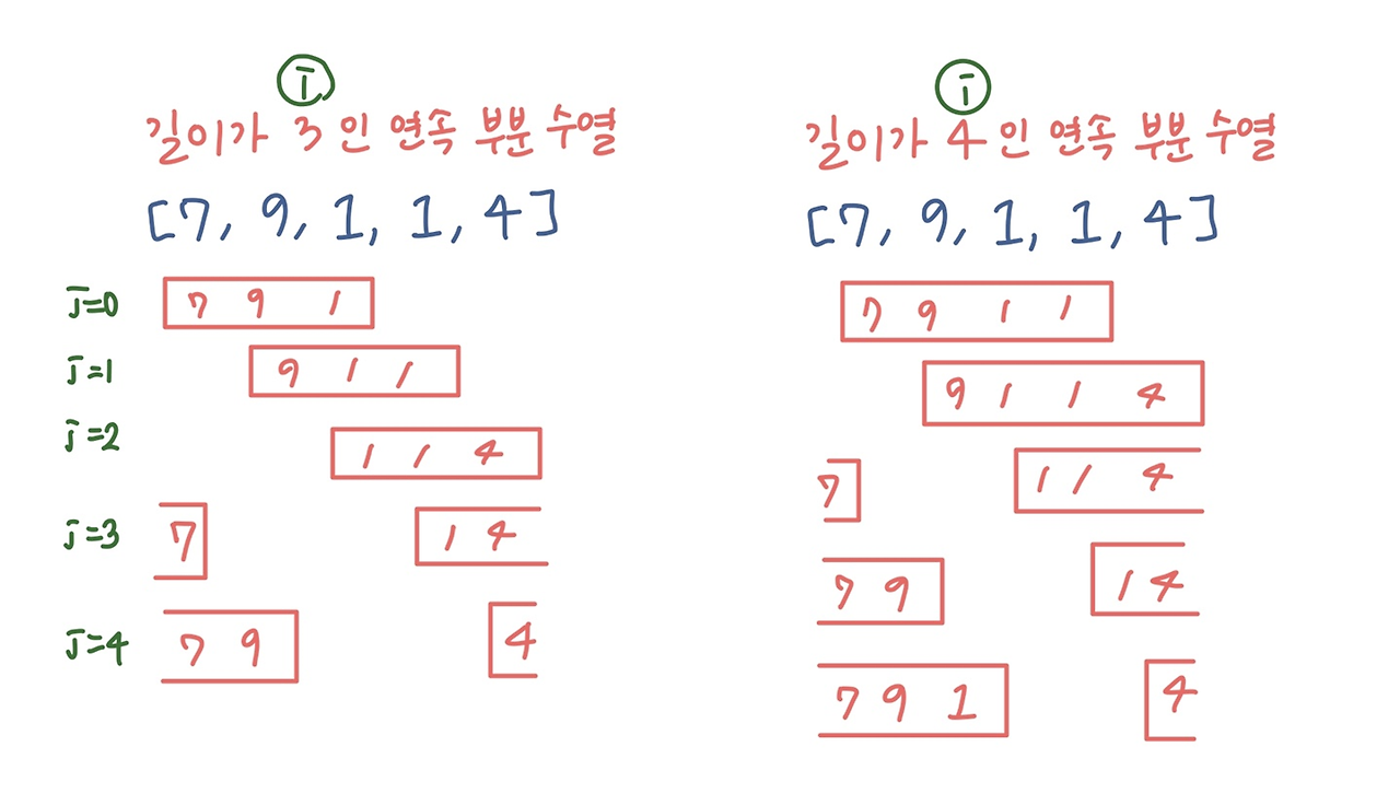 - [첫 번째 for문] 연속 부분 수열의 길이를 i로 두고, 길이가 1인 연속 부분 수열, 길이가 2인 연속 부분수열 ... 경우의 수를 모두 탐색한다.