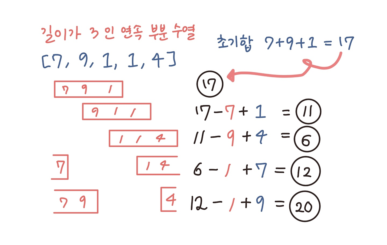 - 이전 합(7+9+1)에서 left값(7)은 빼고, 새로 들어온 right값(1)은 더하면서 계속 새로운 sum을 구한다.
