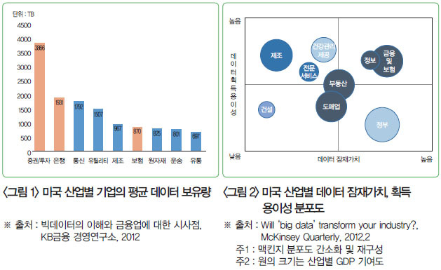 미국의 증권/투자, 은행, 보험업의 데이터 보유량은 전체 산업의 데이터 보유량의 50%가 넘는 수준이며, 금융/보험업이 잠재가치가 높고 데이터 획득이 용이하다.
