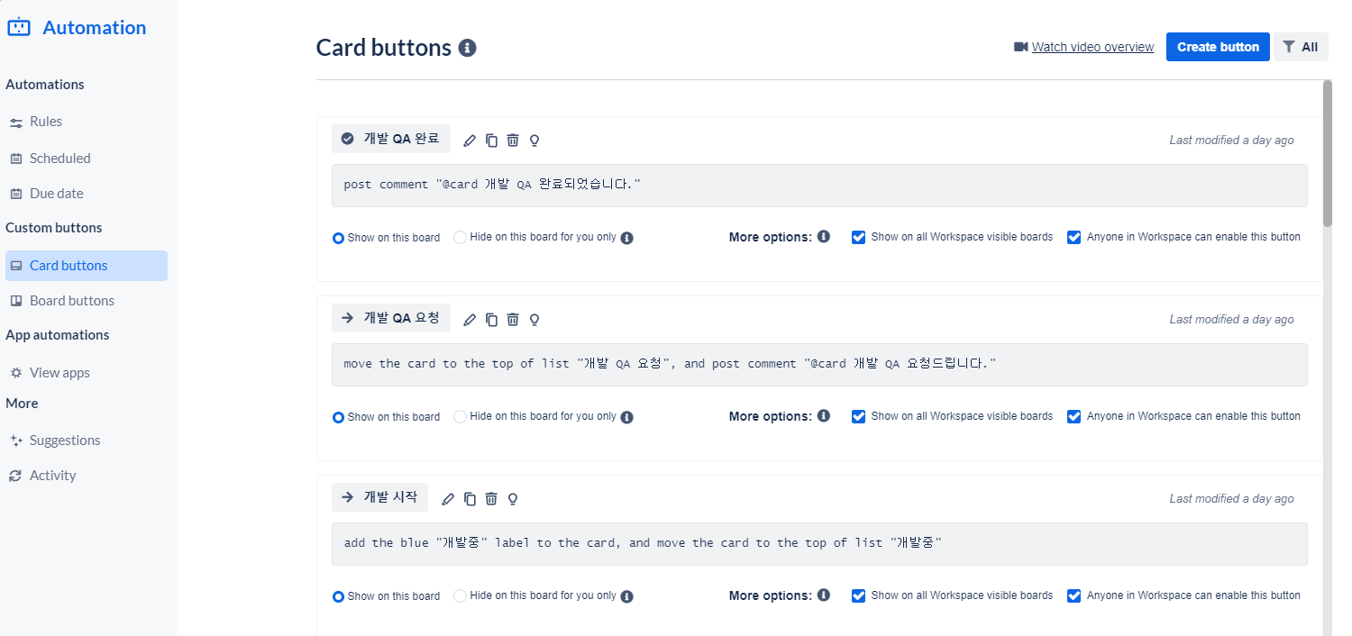 커스텀 버튼을 설정해서 버튼을 누르면 바로 라벨이 업데이트 되고, 코멘트를 달고, 카드를 이동시킬 수 있게 자동화 시스템을 만들 수 있어서 효율성이 높아질 것 같아서 열심히 설정해놨다.