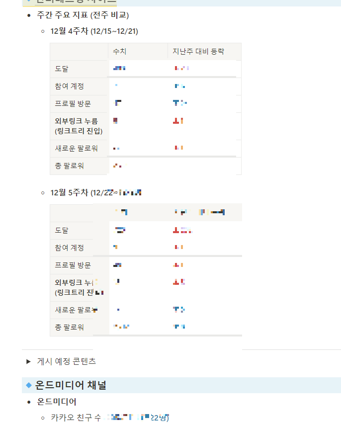 온드미디어 채널이나 인스타그램 운영 등 한 주 데이터를 보고하고,