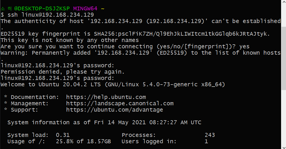 Git-Bash 설치 후 ssh linux@192.168.234.129 입력 (① 방법)