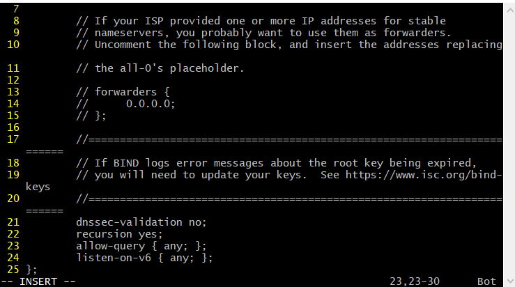 네임서버에 대한 설정 파일에서 21~24 줄을 다음과 같이 변경 (set number을 통해 줄 확인)