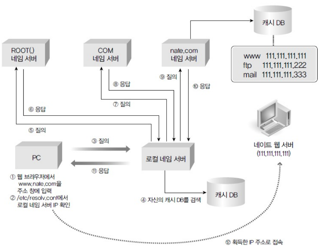 웹브라우저에서 어떤 사이트 주소를 입력했을 때, 먼저 하는 것은 컴퓨터 상의 로컬 네임 서버 IP를 확인. 로컬 네임 서버가 해당 주소의 IP를 알고있으면 알려주고 알고있지 않으면 캐시 DB, ROOT 네임서버 등의 네임서버에 문의해서 IP 주소를 찾아냄.