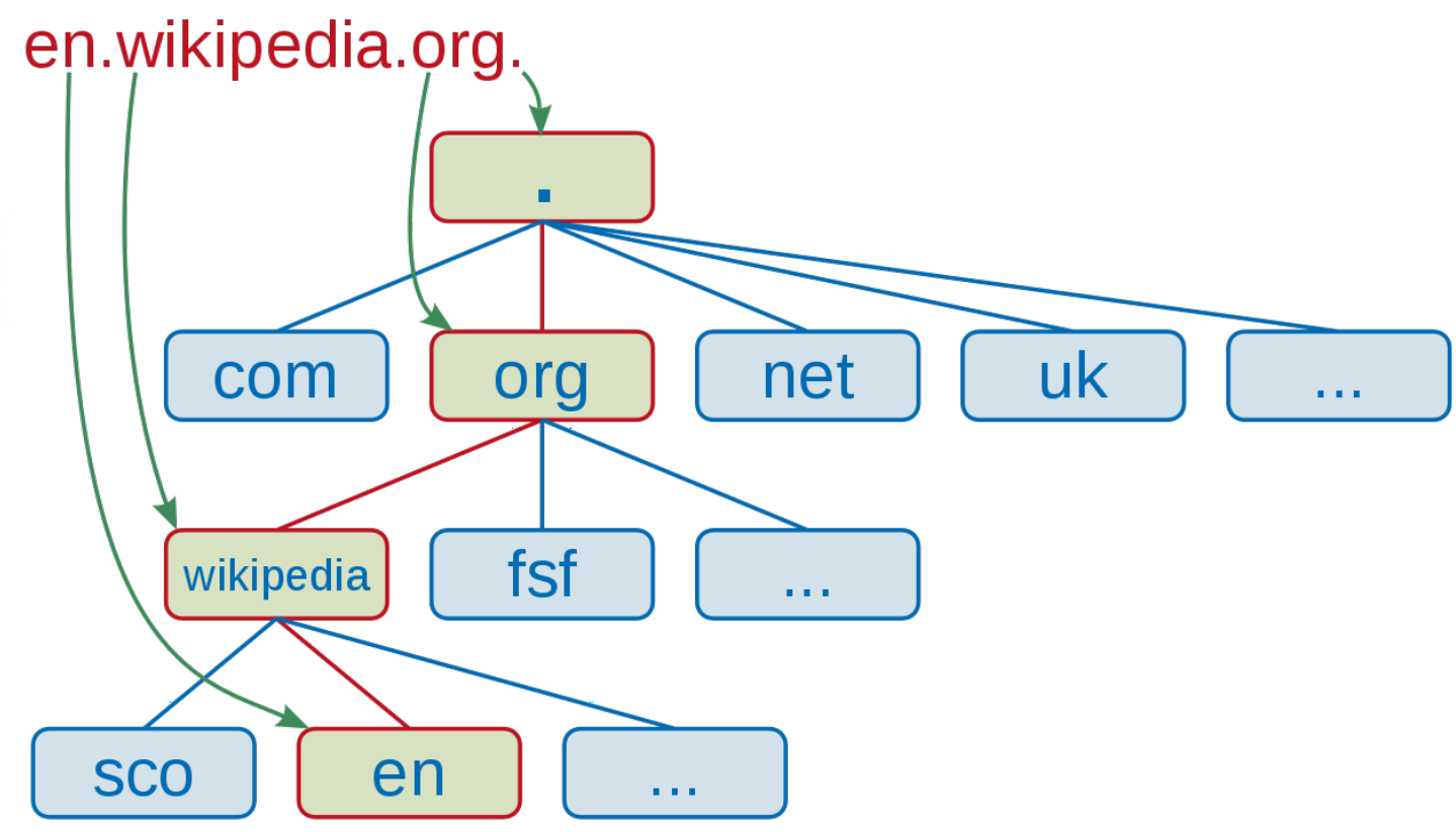 en.wikipedia.org. : 뒤에서부터 읽음, 트리구조로 구성 . -> org -> wikipedia (여기까지는 이름을 나타냄, 물리적인 컴퓨터가 있지는 않음) -> en (실제 물리적인 서버가 있는 곳)