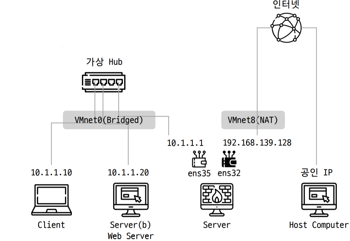 - 외부 컴퓨터가 방화벽 서버의 공인 IP로 웹 서비스를 요청할 때는 내부에 있는 웹 서버가 서비스한다.