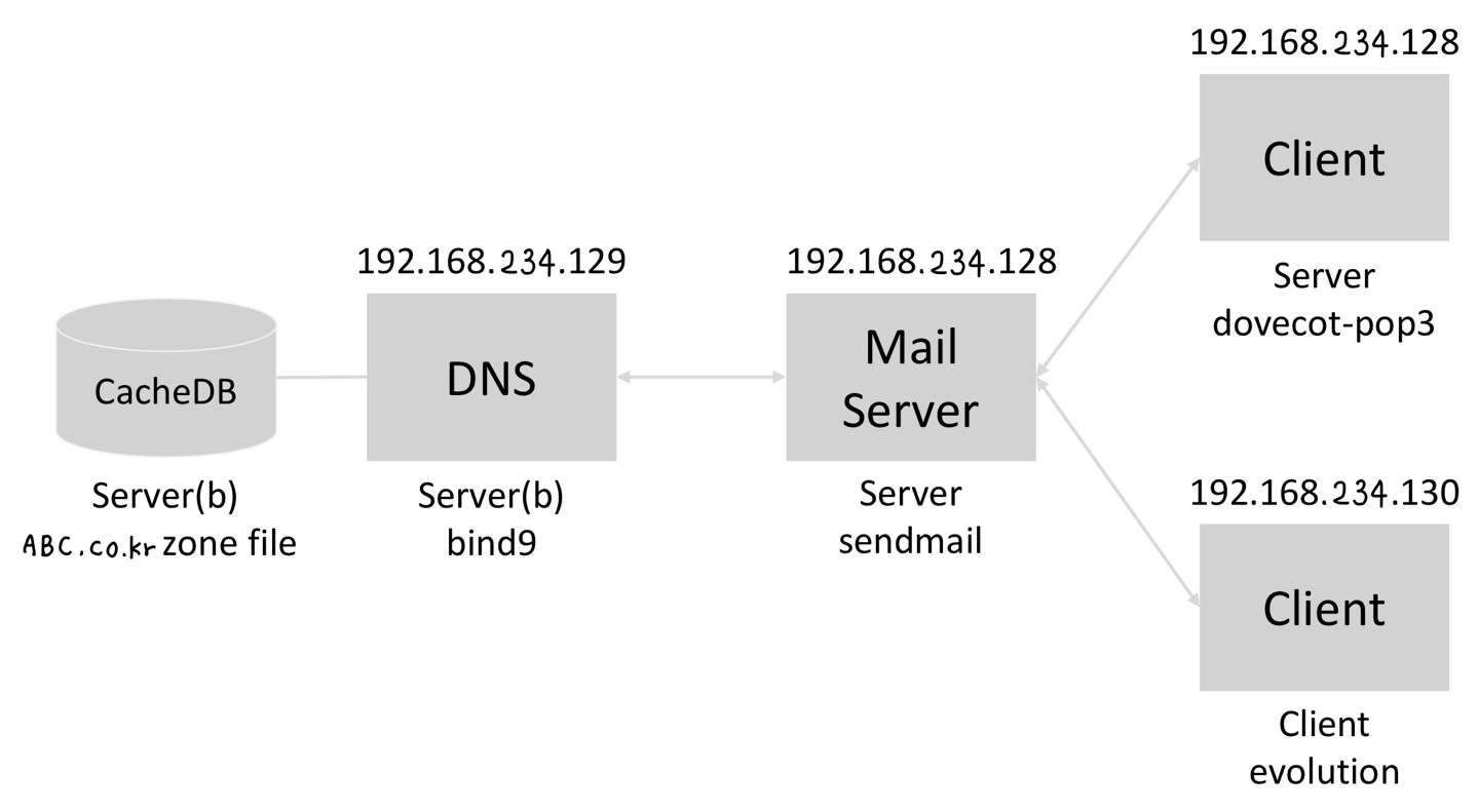 - Server(b)에 bind9 패키지를 이용해 DNS Server를 구축하였으며, Server에는 sendmail과 dovecot-pop3 패키지를 설치하여 mail server를 구축하였다. (전체 시스템 구성도의 Mail Server 구성도 그림과 같은 형태로 구성함.)