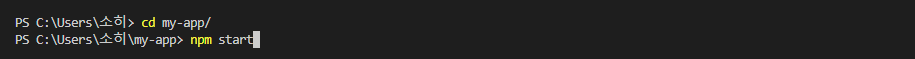 cd 명령어를 사용해서 우리가 생성한 my-app 프로젝트 폴더 안으로 들어가고, npm start 명령을 통해 리액트 애플리케이션을 실행