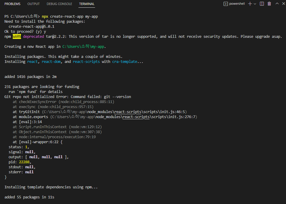 VS Code 터미널에서 npx create-react-app 명령어를 실행