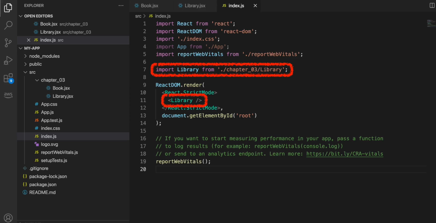 import 문을 사용해서 Library 컴포넌트를 가져온 뒤에, reactDOM을 사용해서 rootDOM 노드에 렌더링하도록 하는 코드로 수정