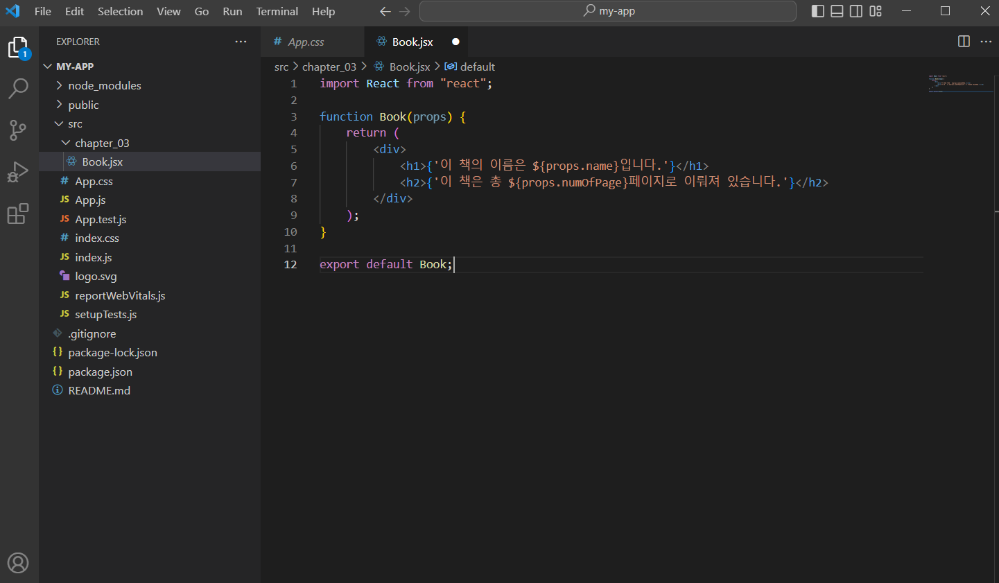 3. 만든 폴더에 Book.jsk라는 이름의 파일을 새로 만들고, Book이라는 이름의 리액트 함수 컴포넌트를 만듦