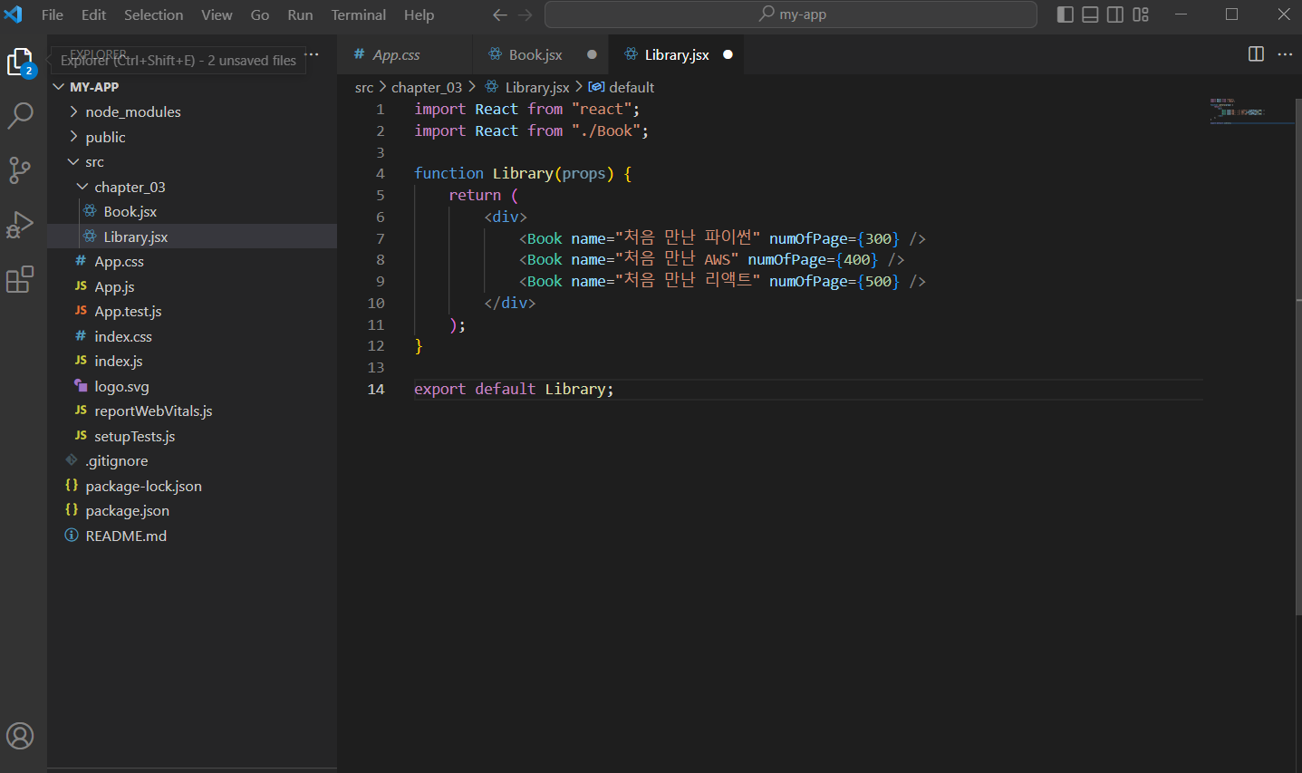 같은 폴더에 Library.jsx라는 이름의 파일을 새로 만들고 Library라는 이름의 리액트 함수 컴포넌트를 만듦