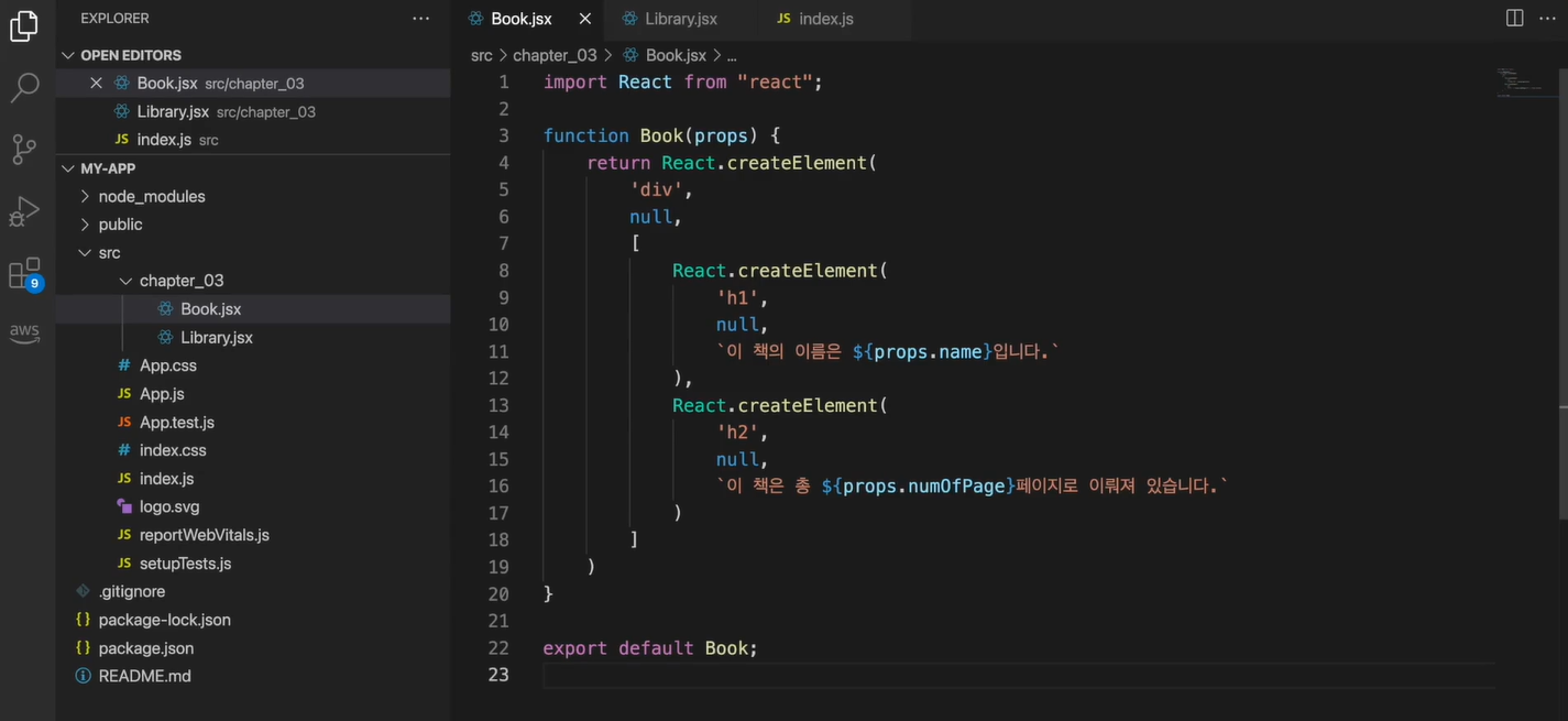 Book 컴포넌트는 props로 name과 numOfPage를 받아서 이를 출력하는 컴포넌트
