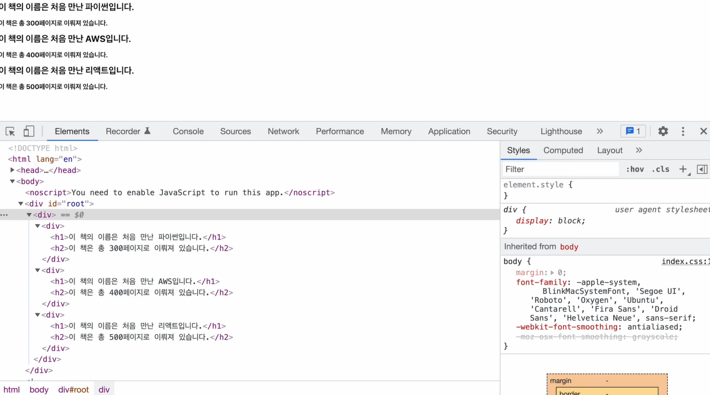 ● 앞에서 만든 리액트 애플리케이션을 실행한 다음, 크롬 브라우저의 개발자 도구에서 elements 탭을 누른 모습 (element들을 모아놓음)