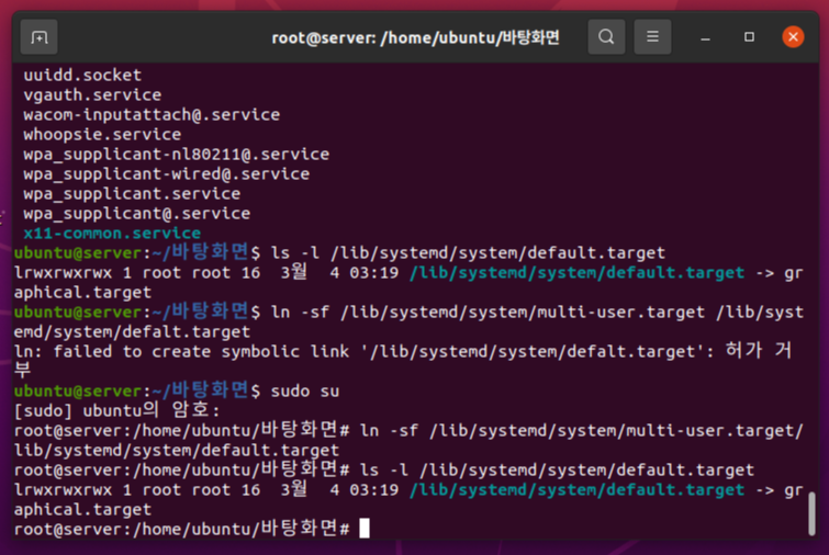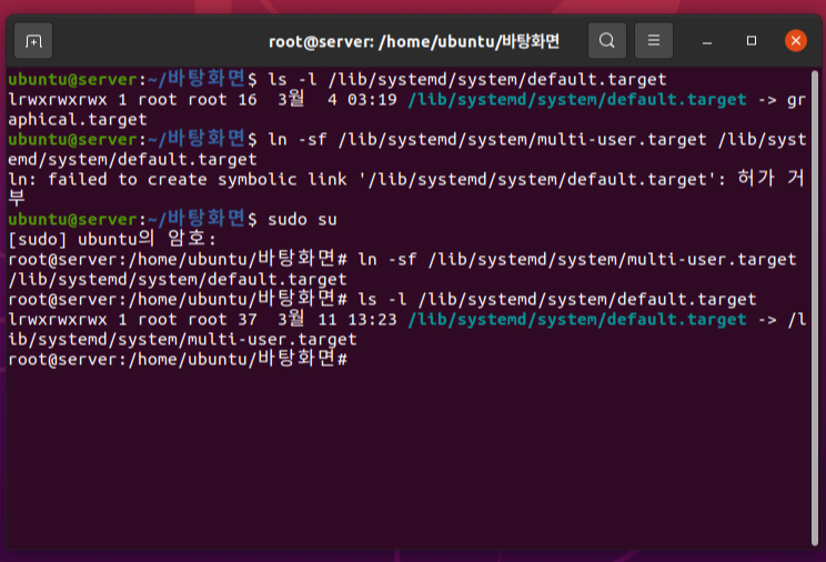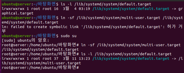 ln -l /lib/systemd/system/default.target 명령어를 실행하면 multi-user.target으로 바뀌어 있어야하는데 바뀌지 않고 그대로 graphical.target이라고 뜨는 오류가 몇 차례 발생했다.