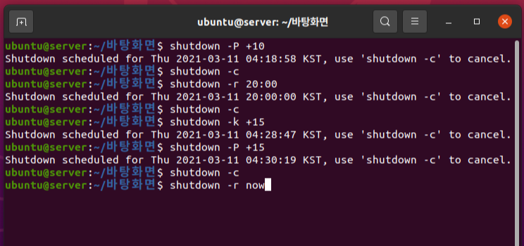 shutdown -r 20:00 : 20시에 재부팅 (reboot의 r)