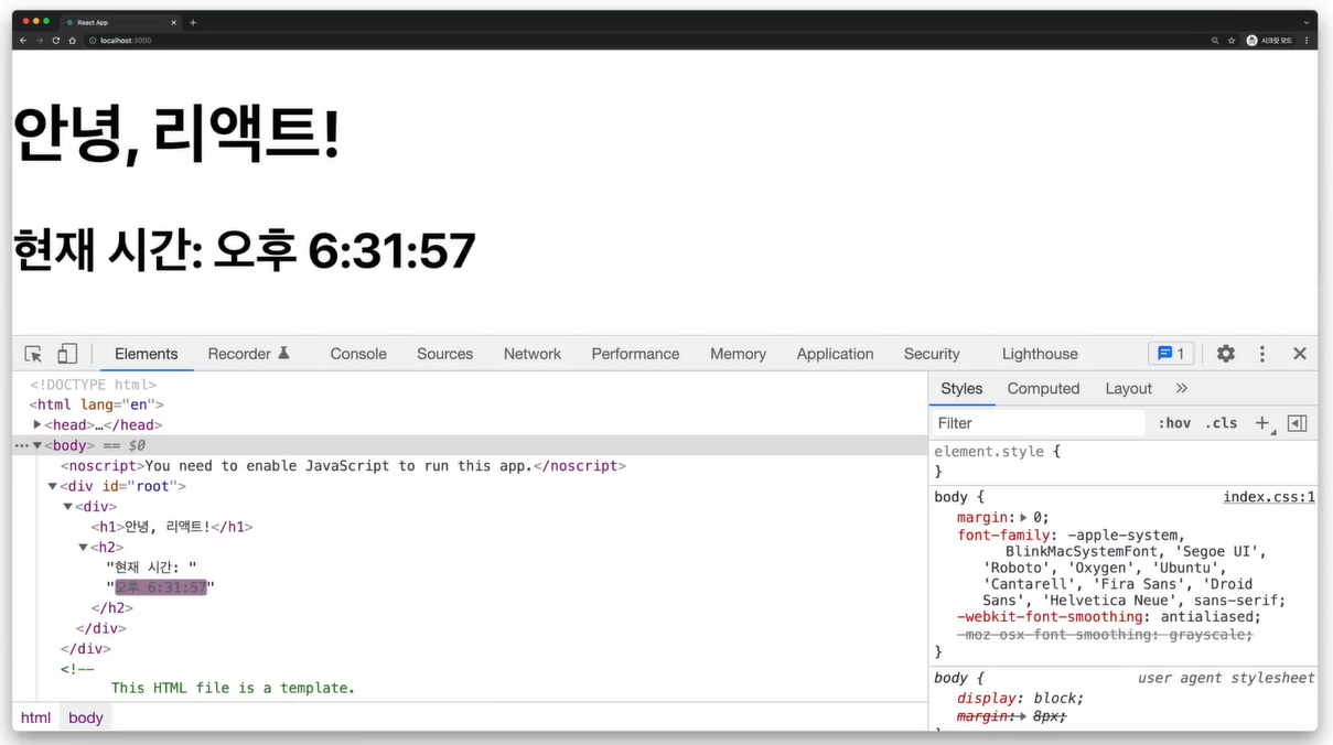 <h2>현재 시간: {new Date().toLocaleTimeString()}</h2>