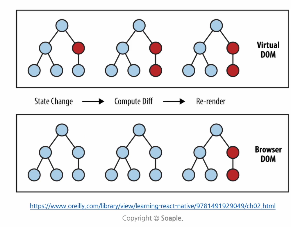● 화면에 새로운 내용을 보여주기 위해서 virtual DOM은 변경된 부분을 계산(compute Diff)하고 해당 부분만을 다시 렌더링함(Re-render)