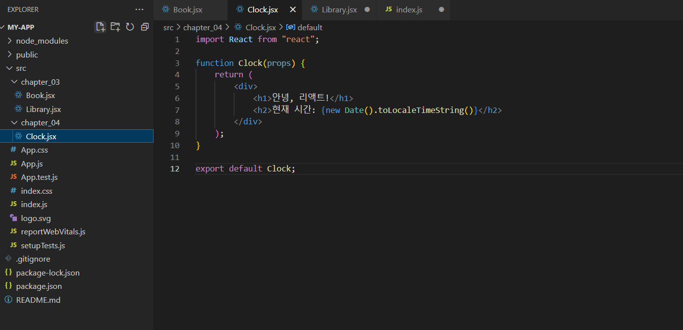 4. Clock이라는 이름의 리액트 함수 컴포넌트 작성