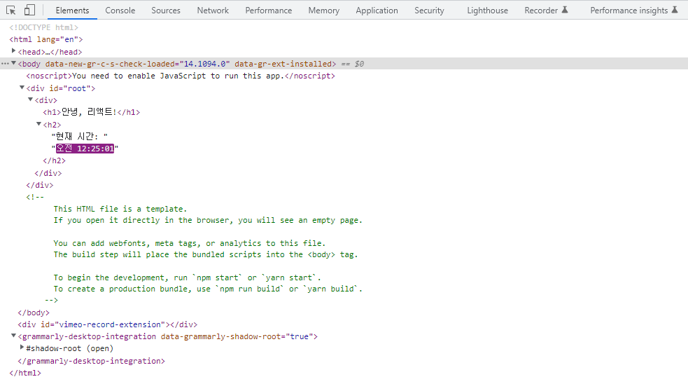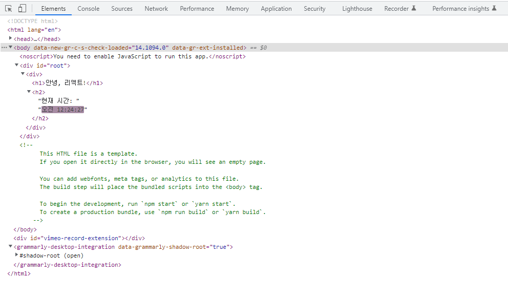 크롬 개발자 도구를 열어 elements 탭에서 root div를 펼쳐보면, 매 초 시간이 바뀌면서 변경된 부분이 깜빡이는 것을 볼 수 있음