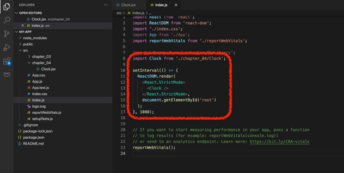 setInterval() 함수를 이용하여 1000ms마다 새롭게 Clock 컴포넌트를 root div에 렌더링하도록 만든 코드