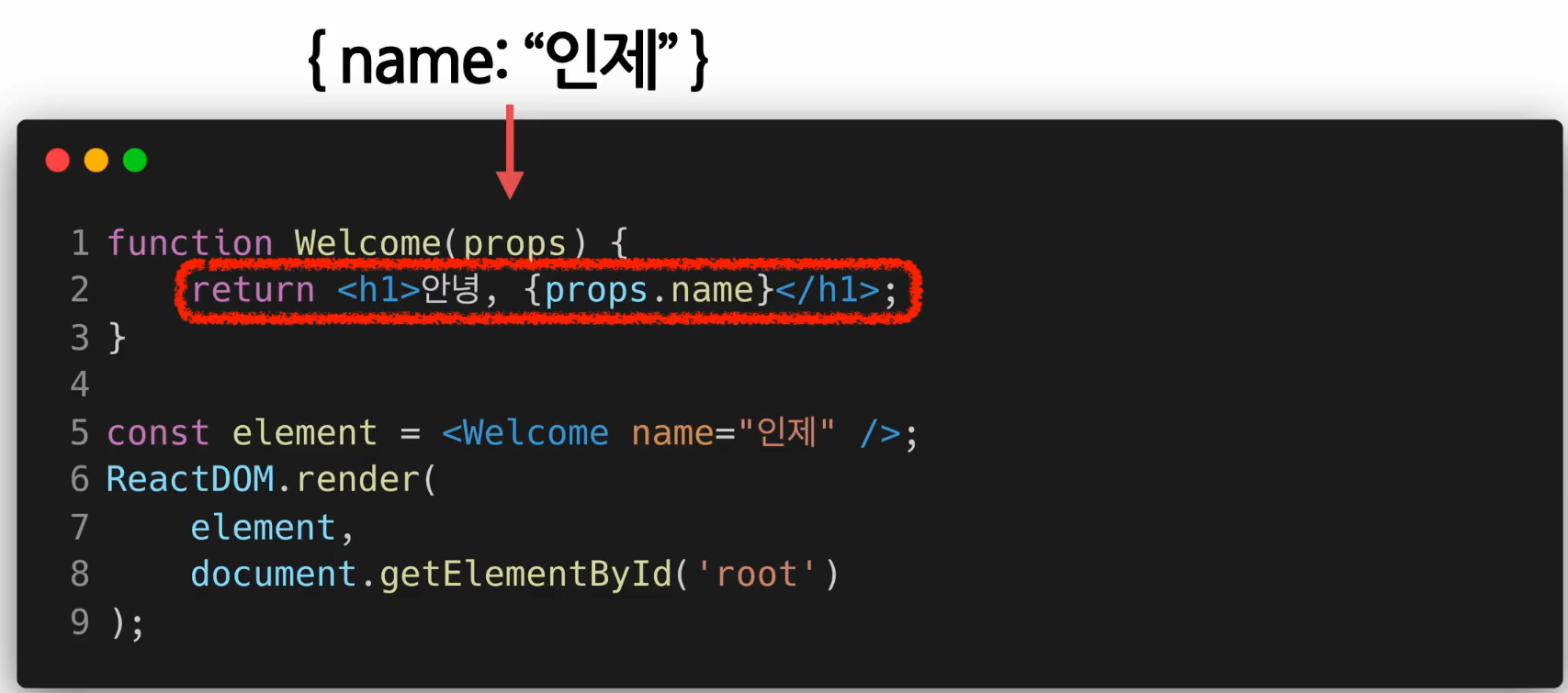 => 리액트에서는 Welcome 컴포넌트에 {name: "인제"}라는 props를 넣어서 호출하고, 그 결과로 리액트 엘리먼트가 생성