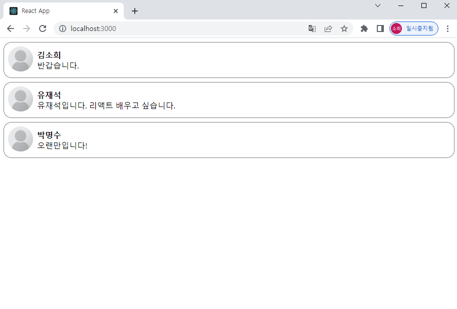 브라우저를 확인해보면, comments 배열에 있는 댓글 객체의 수 만큼 comment 컴포넌트가 렌더링 됨