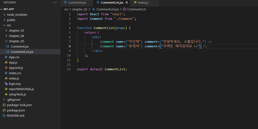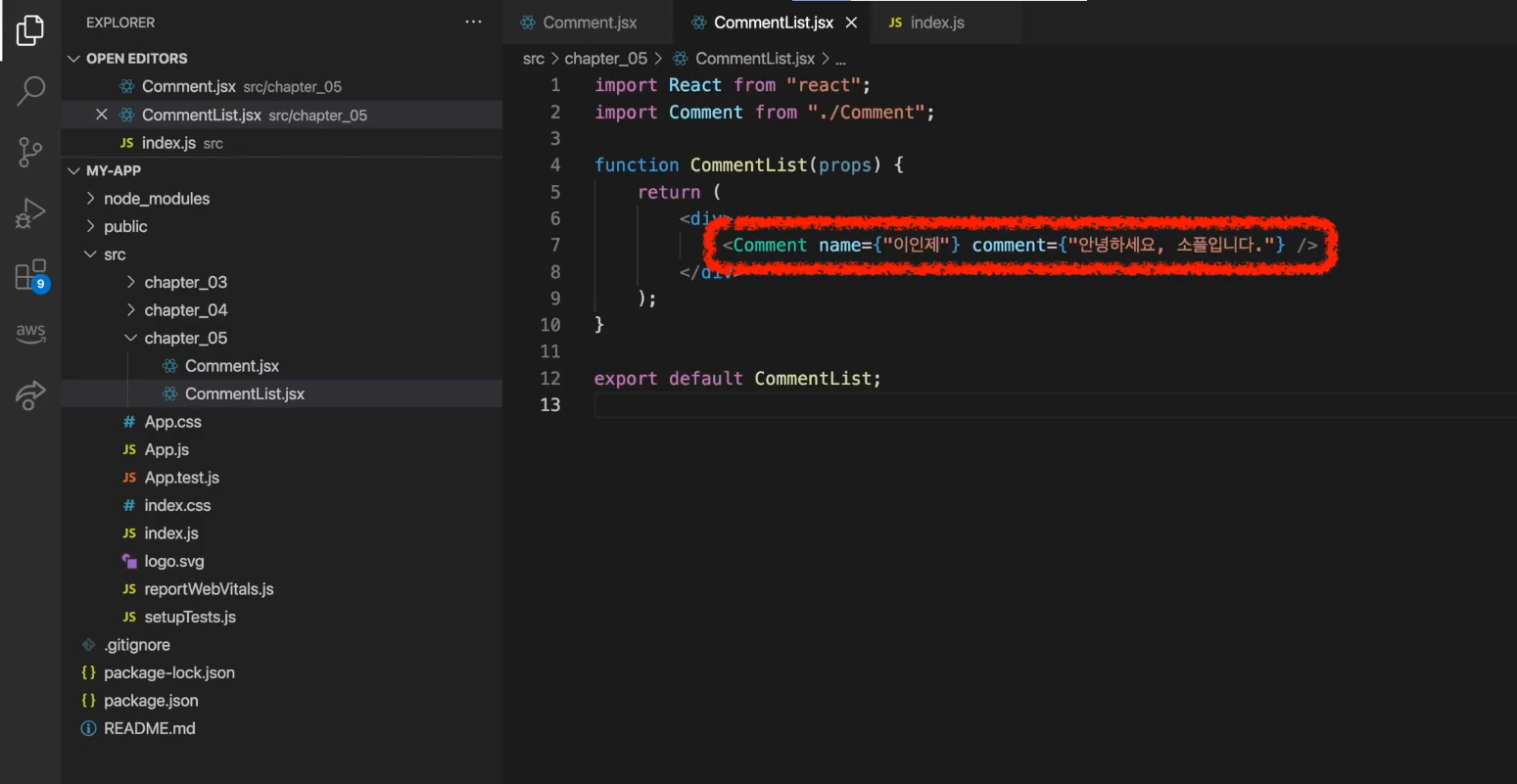6. 만든 commentList 컴포넌트를 화면에 렌더링하기 위해 index.js 파일을 열어서 수정