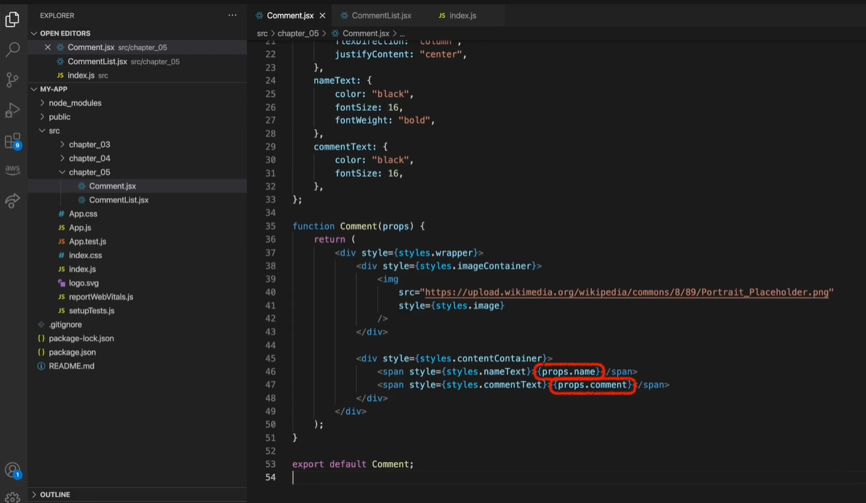 1. 작성자 이름과 댓글 내용을 각각 props.name, props.comment 값을 사용하도록 변경