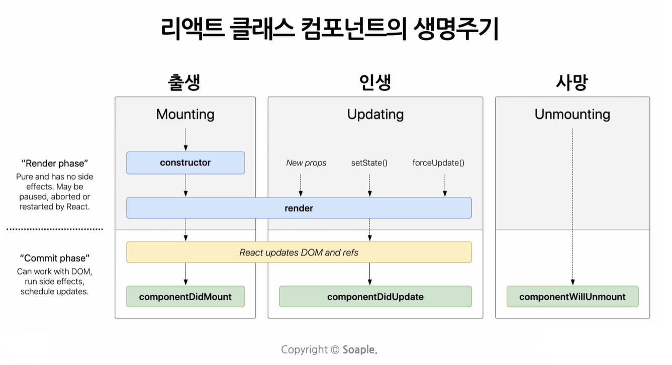 ● 리액트 클래스 컴포넌트의 생명주기는 출생, 인생, 사망으로 나누어짐