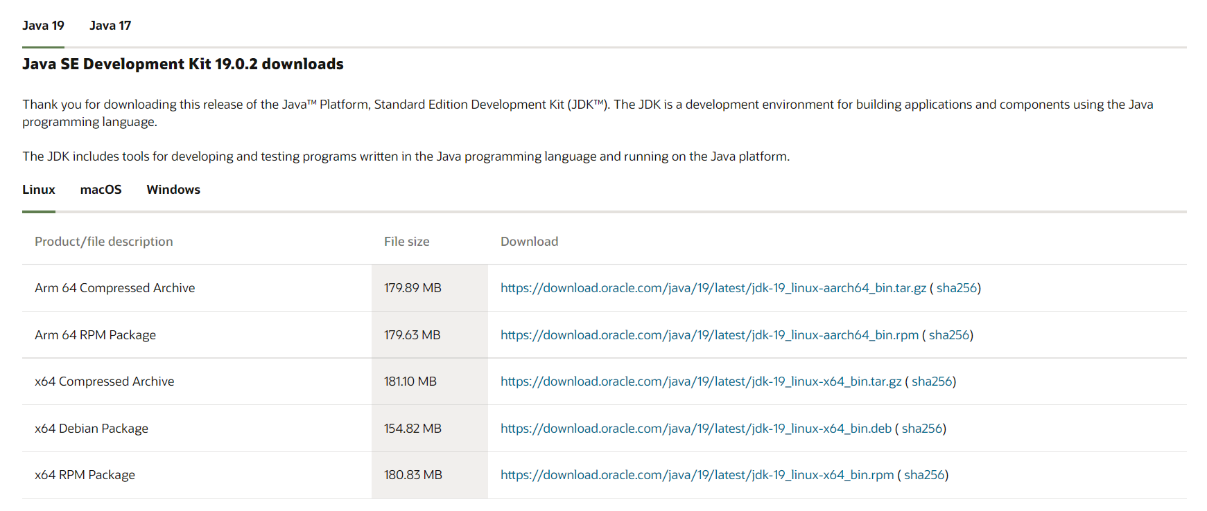위 링크의 페이지에서 Java 19, Java 17을 다운받을 수 있습니다