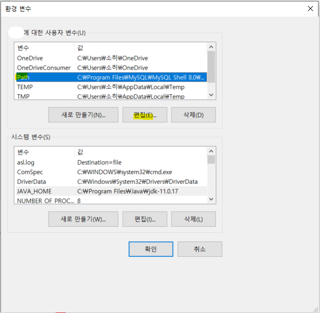 시스템 변수 이름 중 Path를 찾아 클릭하고 편집을 누릅니다.