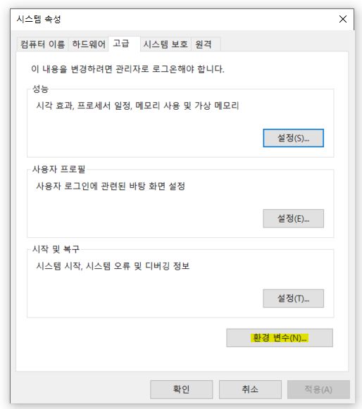 상단바의 고급 > 환경변수를 눌러주고