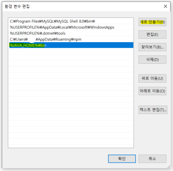 오른쪽 상단의 새로 만들기를 눌러 위와 같이 %JAVA_HOME%₩bin을 입력해줍니다.