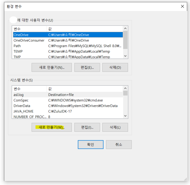 누르면 위와 같은 새 시스템 변수 창이 뜹니다.