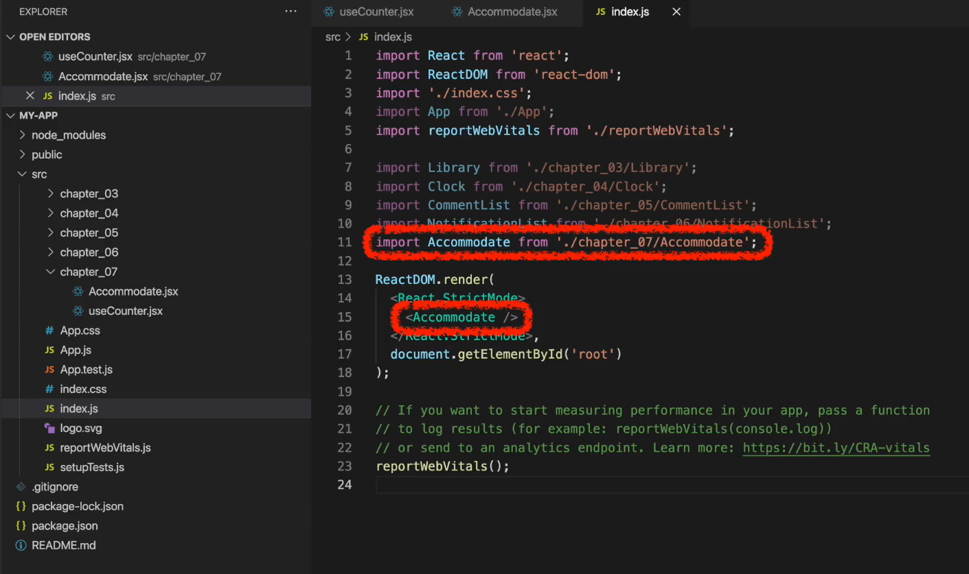 2. 만든 Accommodate 컴포넌트를 화면에 렌더링하기 위해 index.js 수정