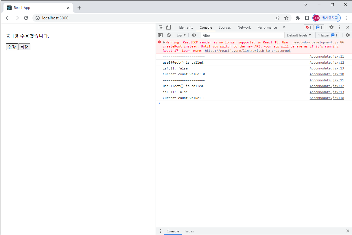 입장 버튼을 눌러보면 마찬가지로 두 개의 useEffect() 훅이 호출되는데, count 값은 1 증가한 것을 볼 수 있습니다