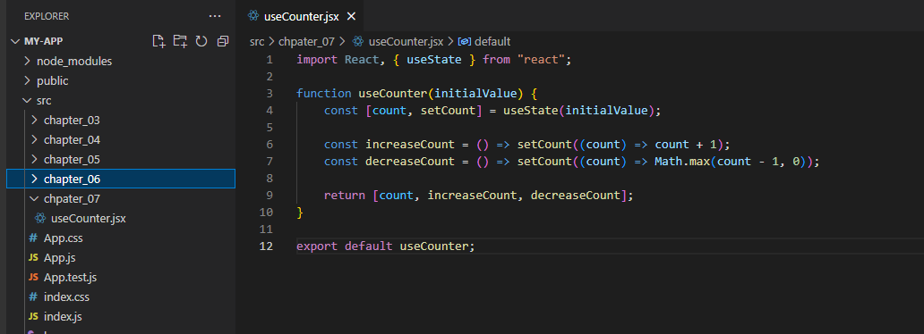 3. 만든 폴더에 useCounter.jsx라는 이름의 파일을 만들고 useCounter라는 이름의 리액트 훅을 만듦