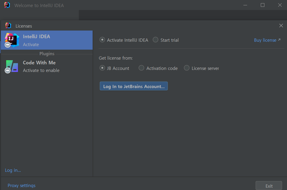 다음과 같은 창이 뜨고, 앞서 만들었던 계정으로 로그인하면 IntelliJ를 사용하실 수 있습니다.