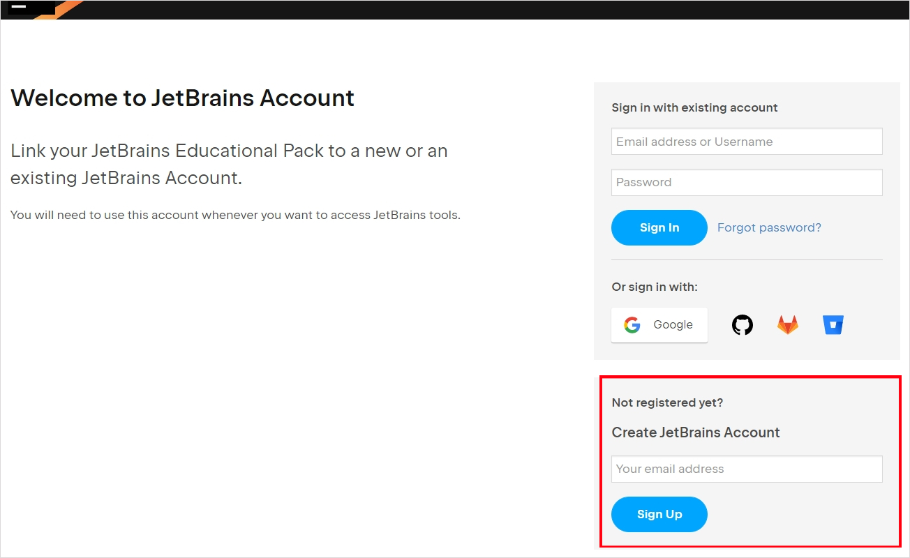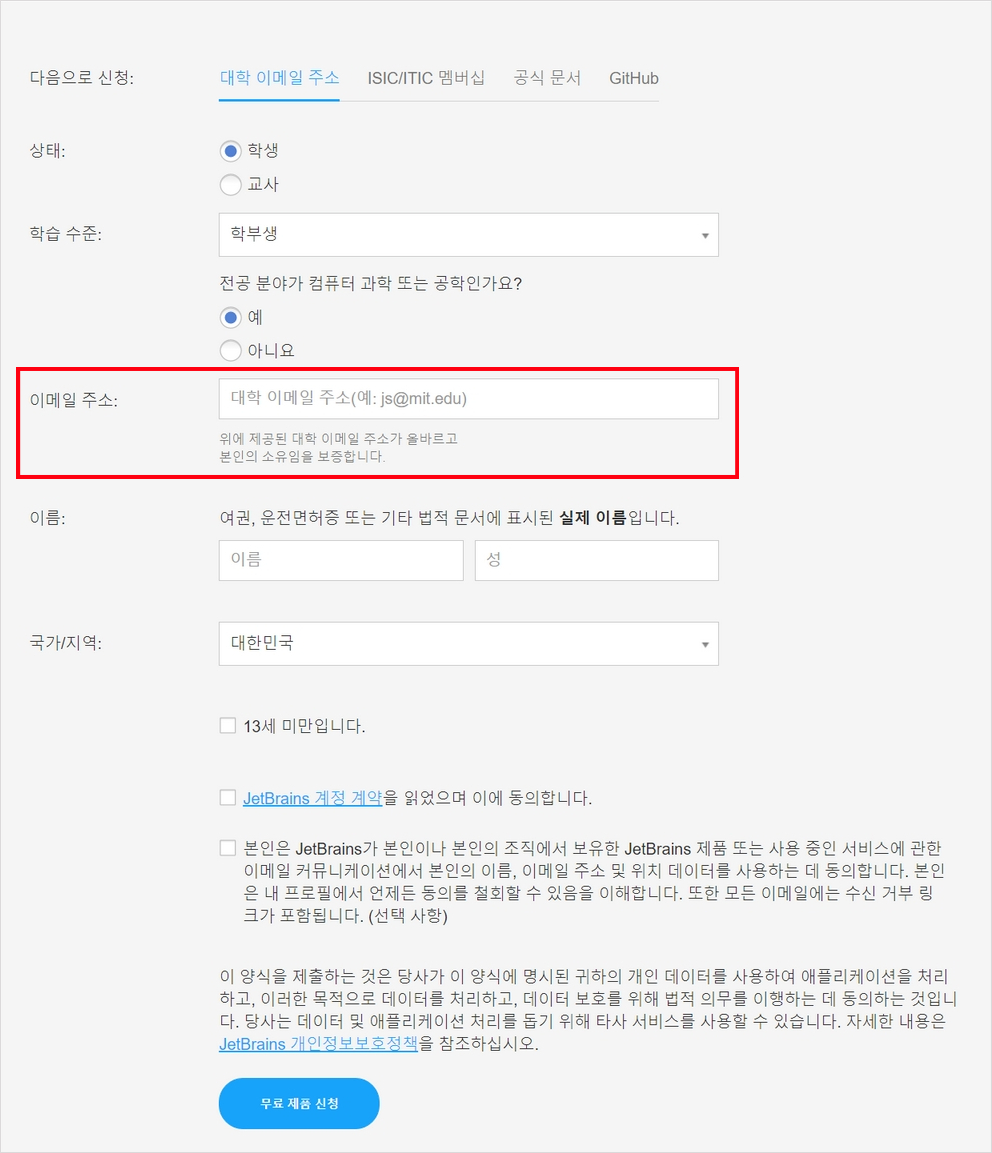 Create JetBrains Account에 학교 계정을 넣어줍니다.