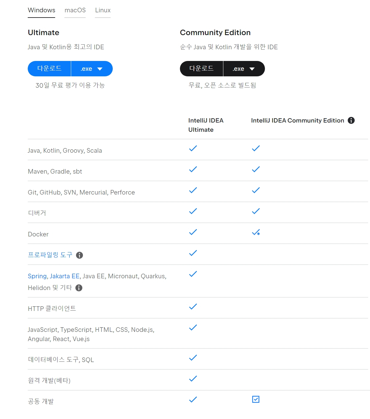 IntelliJ Ultimate(유료 버전)과 Community Eddition(무료 버전) 차이