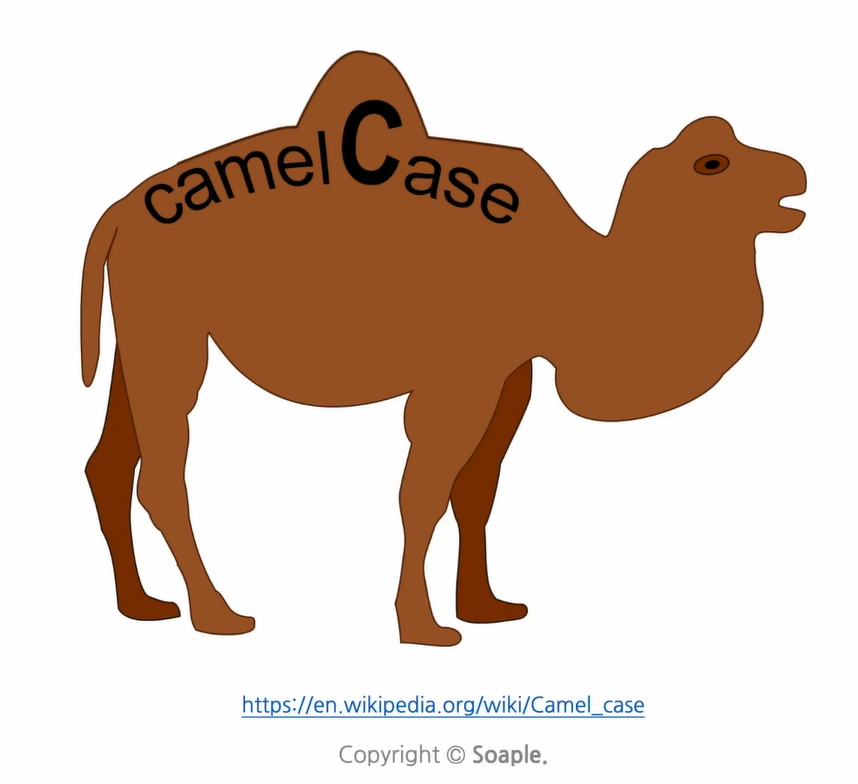 첫 글자는 소문자로 시작하되 중간에 나오는 새로운 단어의 첫 글자를 대문자로 사용하여 글자의 크기가 변하는 것이 낙타의 등과 같다고 해서 지어진 이름