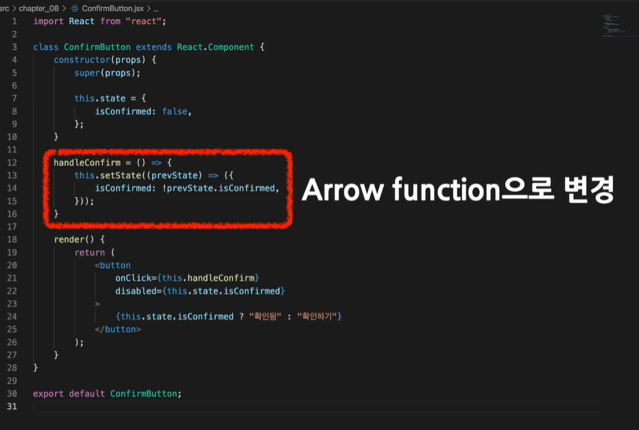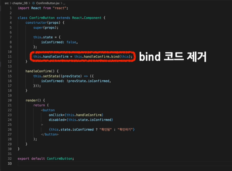 앞에서 만든 ConfirmButton 컴포넌트의 event handler를 bind 대신 Class fields syntax를 사용하도록 변경해보겠습니다.