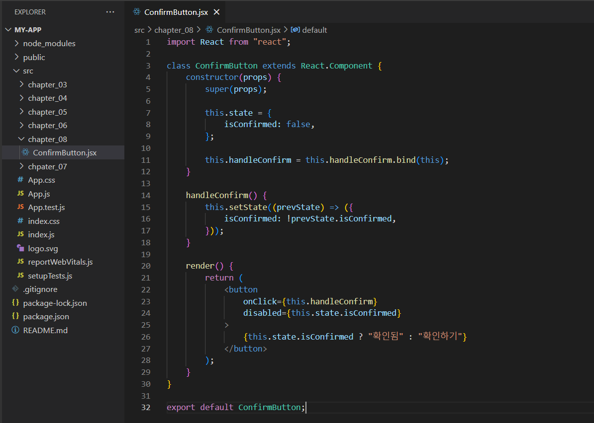 3. 만든 폴더에 ConfirmButton.jsx라는 이름의 파일을 새로 만들고, ConfirmButton이라는 이름의 클래스 컴포넌트를 만든다.