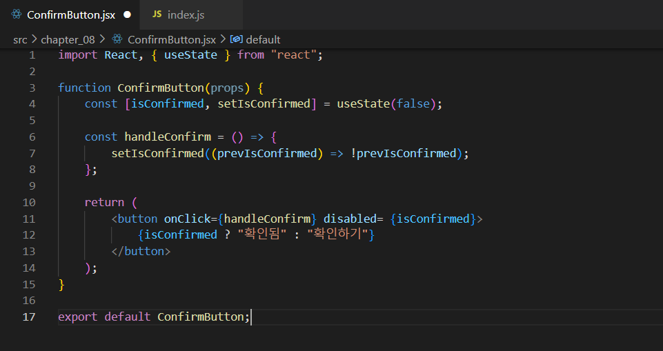 - ConfirmButton 컴포넌트는 확인 여부를 저장하기 위해 state에 isConfirmed라는 변수를 하나 가지고 있으며, 초기값은 false