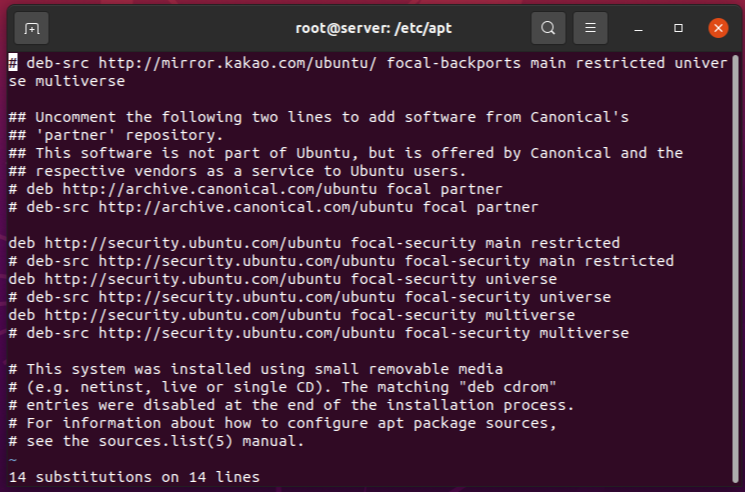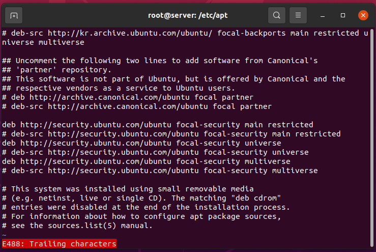 온라인 저장소 변경 과정에서 %s/kr.archive.ubuntu.com/mirror.kakao.com을 입력하는 과정에서 'E488: Trailing characters'라는 에러가 발생했다. 살펴보니 어떤 문자가 잘못된 것 같아 다시 입력해보니 정상적으로 실행되었다.