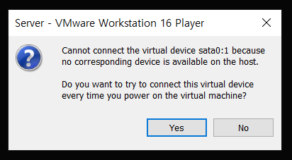 VMware Workstation “Cannot connect the virtual device sata0:1/ide1:0 because no corresponding device is available on the host. Do you want to try to connect virtual device every time you power on t..