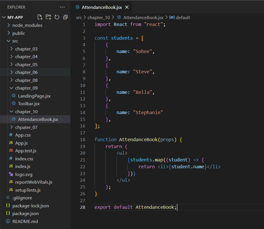 3. 만든 폴더에 AttendanceBook.jsx라는 이름의 파일을 새로 만들고, 아래 코드처럼 AttendanceBook이라는 이름의 함수 컴포넌트를 만든다.